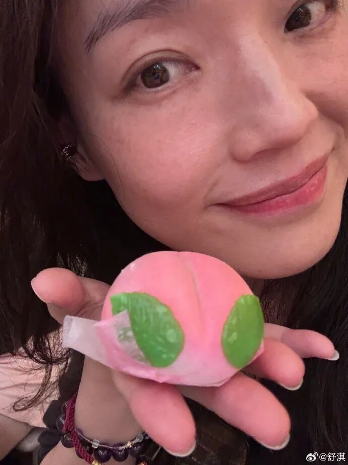照片中49岁的舒淇穿黑衣披散长发,素颜举着寿桃拍照,状态在线。